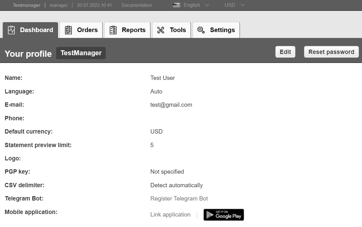 By clicking on Manager name on the top left side of header you will be redirected to user profile where you can setup your profile. From the right side of page you will see to pages Common and Orders full view settings: