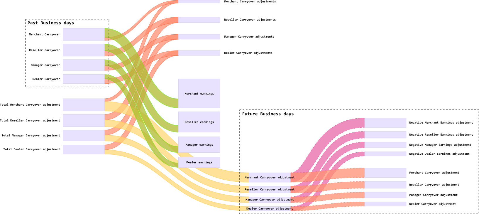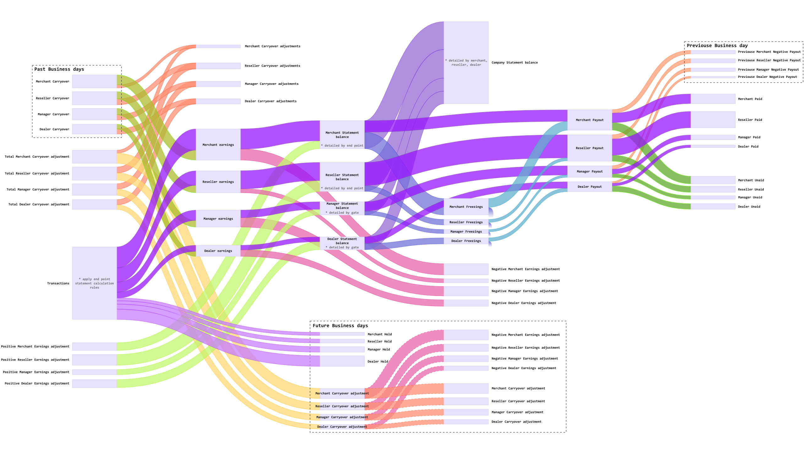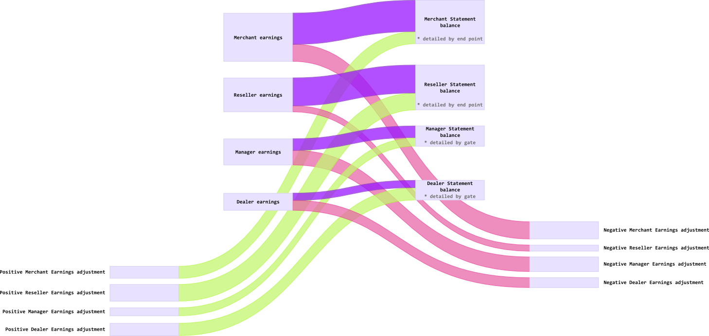 merchant statements are generated, merchant statements are detailed by terminals, indicating the reseller; adjustments are applied to the carryover paid to the merchant from the reseller or manager in his absence; earnings adjustments are accrued; the final balance of the current period is calculated as: the difference between the reseller (manager) and merchant transaction commissions applied; in the final, the reseller (manager) carryover is added minus the carryover adjustments and the amount of the merchant’s transactions excluding the amount of service operations and a Money Transfer type operation,