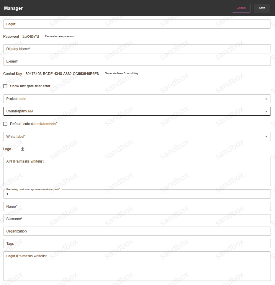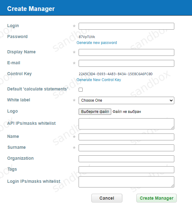 Anakatech platform contains integrated calculation system to reflect the tariffication between business process partners. Calculation happens on each level, from dealer to merchant. Bank fees are calculated for tariffication and settlement, but statements for settlement with the bank are not provided by the system. Instead, the system calculates statements per Merchant and indicates which exact amount should be received from the bank. Statement is individually generated for each manager or each merchant of this manager. Statement date is called business day. Statement for business day contains all projects for chosen manager. Statements will be calculated for manager if such option is enabled. If statement should be calculated, enable the Default calculate statements flag in manager account details. If this option is not enabled, statements setting in projects of exact manager will be unavailable and statements are not calculated.