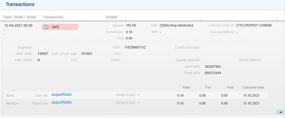 The amount to be paid for positive transactions that is included to the statement may be partially withheld for periods comparable with dispute flow and fraud claims. Holding mechanisms are used for this purpose. Holding period and amount are specified in the rate plan. The hold period is set in days. The hold value is set in percent. It is not possible to change these values after calculating the rates for the processed transaction. Each transaction has a unique period and a holding percentage calculated on the date of its processing.