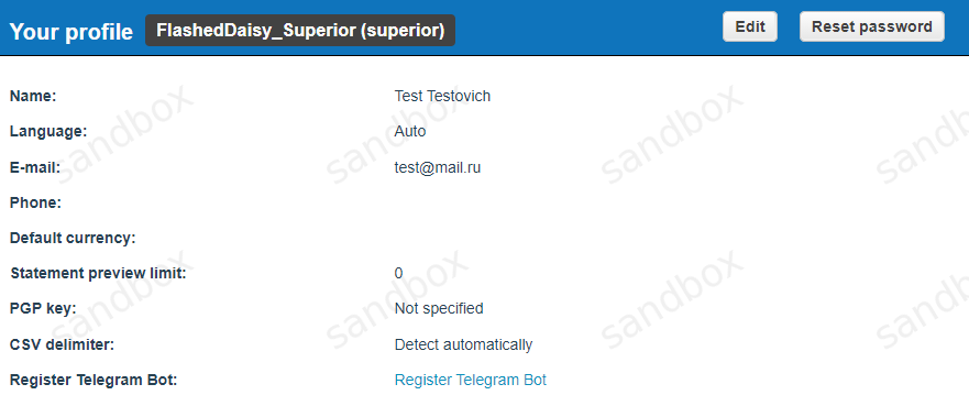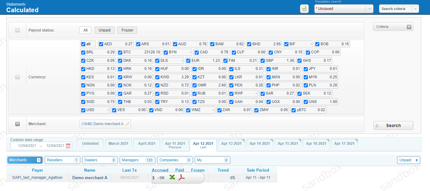 The calculated balance of the current period for each type of user is added to its current balance. The balance is maintained individually for each currency. For merchants, the balance is also detailed by the reseller, if available. The company’s balance sheet is not taken into account. The counterparty’s current balance is defined as the sum of the current balance of all its statements, minus paid and frozen funds.
