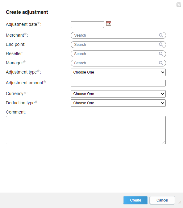 Statements can take into account not only the transaction commission. The statement balance can be changed by means of adjustments that can be accrued for any counterparty from the dealer to the merchant. Adjustments can be applied to the statement on a special screen in the menu “Reports” – “Statements” – “Adjustments”.