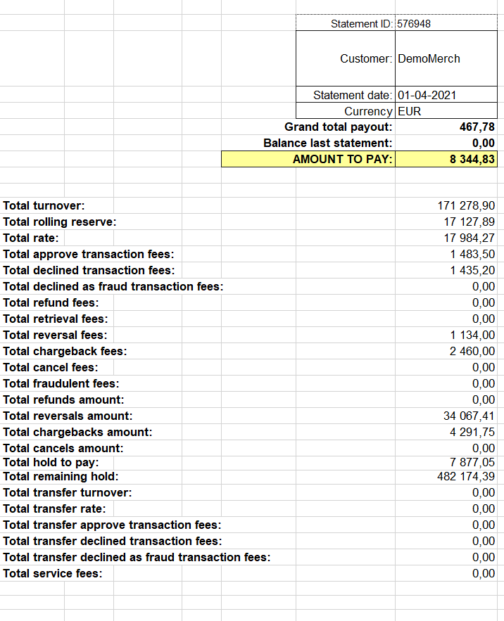 after the formation of statements for all counterparties are combined into statements for companies; statements for companies are detailed by merchant, reseller, dealer and manager, for the possibility of accounting for paid funds on the company’s balance sheet; of all the carryovers and holds, only the bank’s carryover and hold are taken into account in the company’s statements.