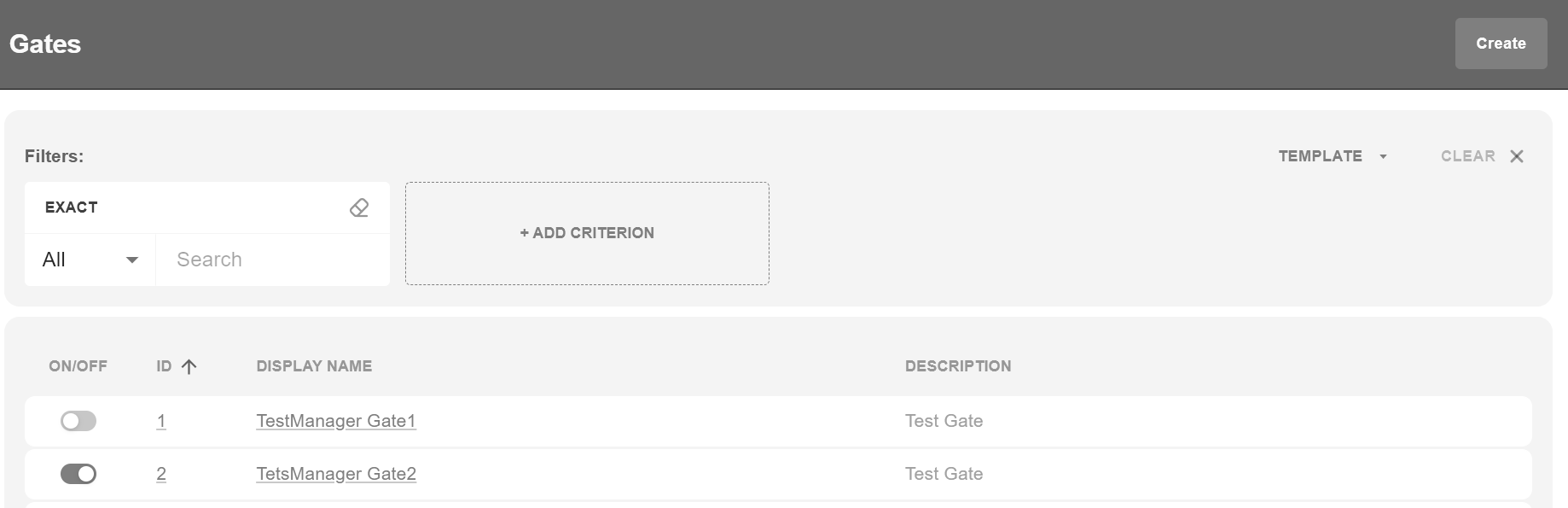 Gate is a set of parameters, which identify account registered in a third-party processing system. These parameters can be used to process payment data in an external system using the messaging protocol implemented in the Processor. The Gate list screen is located at Settings -> Configuration -> Gates. This screen contains all Gates created for Manager in the system.