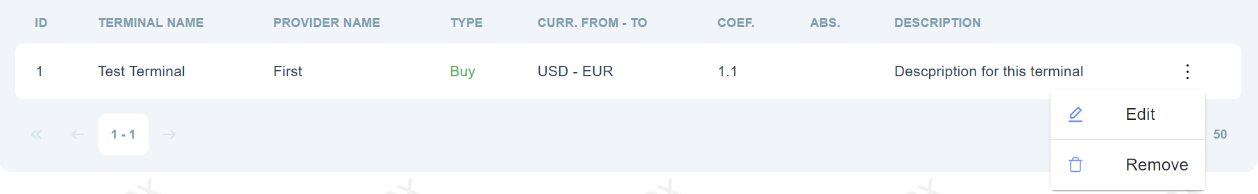 It is possible to remove or edit Terminal anytime. It is not possible to edit all fields of the already existing Terminal. To edit Terminal settings, click three dots as shown below:
