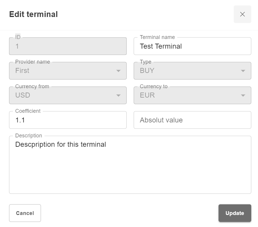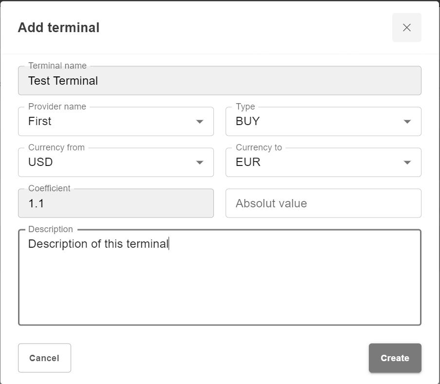To create a new Terminal for Provider, click the “+ Add terminal” button. New window with parameters will appear as shown below: