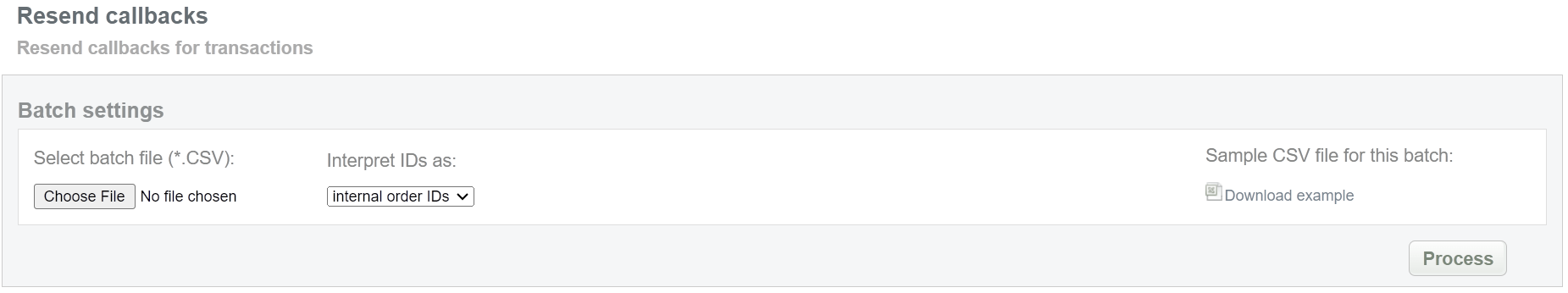 This batch operation can be useful if information on the final status of transactions is available in Anakatech system and for some reason is not available in the Connecting Party system. Collect the order IDs, assigned by Anakatech system to the CSV file and upload it to send new callback notifications. An example of CSV file for upload is available on the same screen.