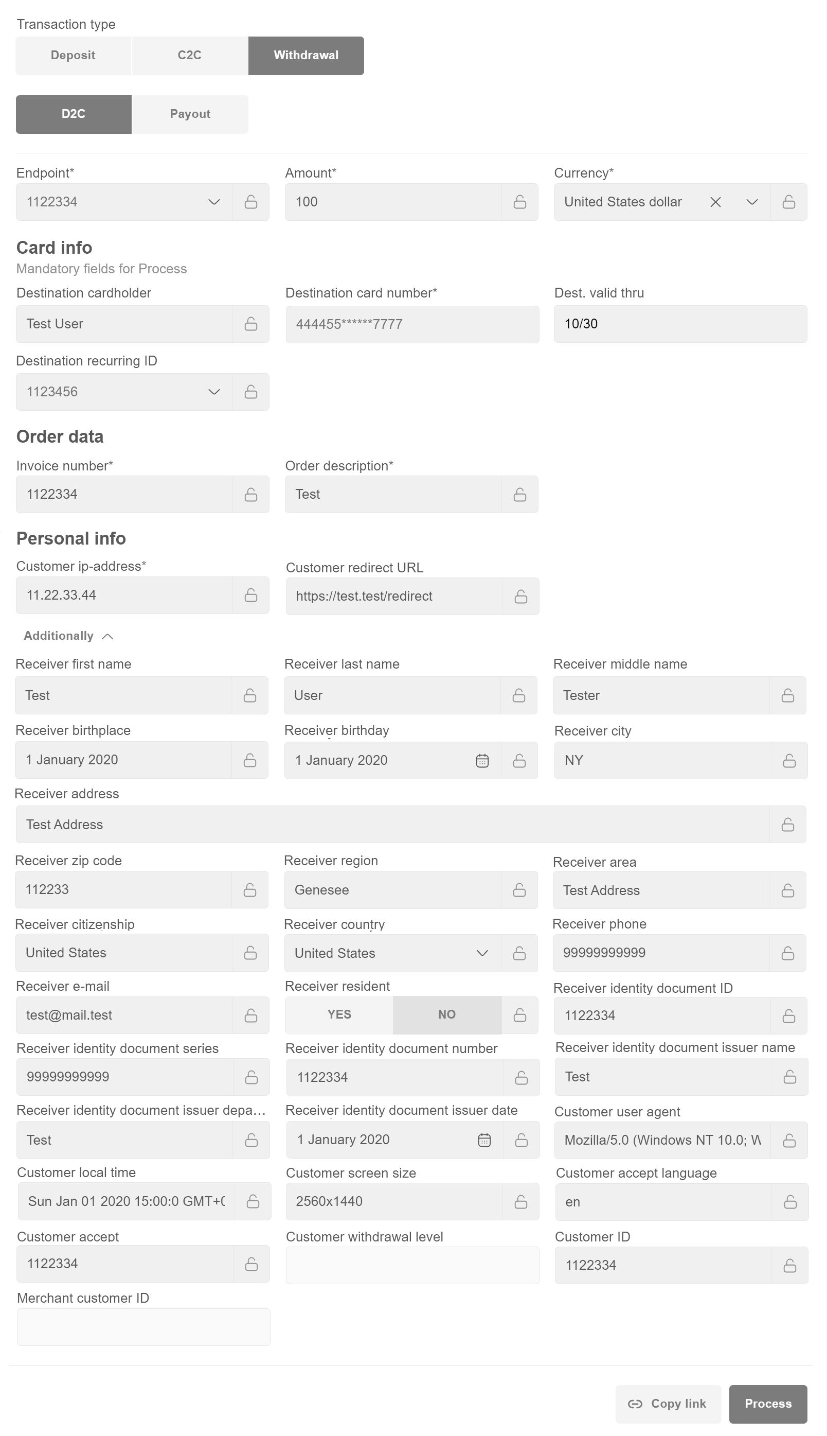 Sender data is retrieved using Recurring ID. The sender Card info (Cardholder, Card number, Valid thru) and Personal info (First name, Last name, City, Address, Zip code, Phone, E-mail, Customer IP-address, Country and other optional customer data) sections will be filled in automatically. CVV is not stored and must be requested from sender. To speed up the filling of sender fields, use the Last used section new to “Recurring ID” field, which contains previously used Recurring IDs. The Merchant creates a special link for the sender with “Copy link”. The sender receives the link to a form in which he fills the destination card number, then passes the 3DS check if needed.