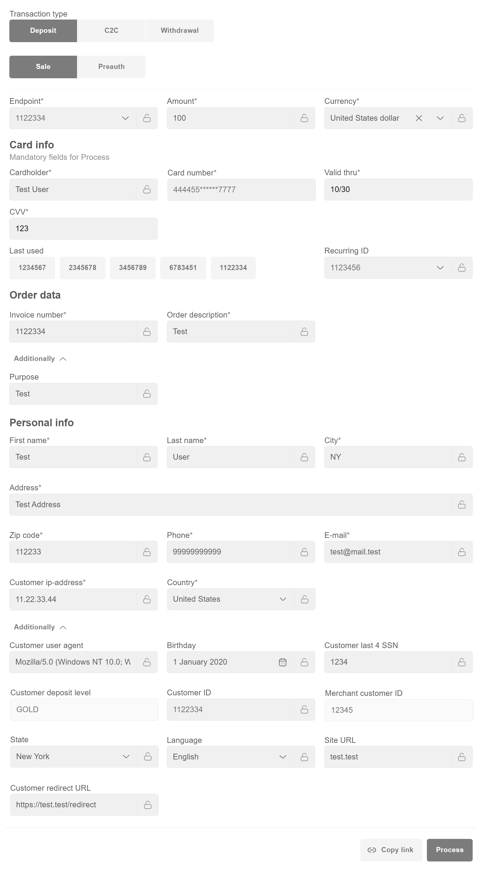 - can be filled automatically together with Personal info, if Recurring ID is provided. If Recurring ID is provided and CVV field is empty, use “Copy link” to provide form to customer for additional confirmation. In case if it will be filled in VT form directly then transaction will be processed directly.